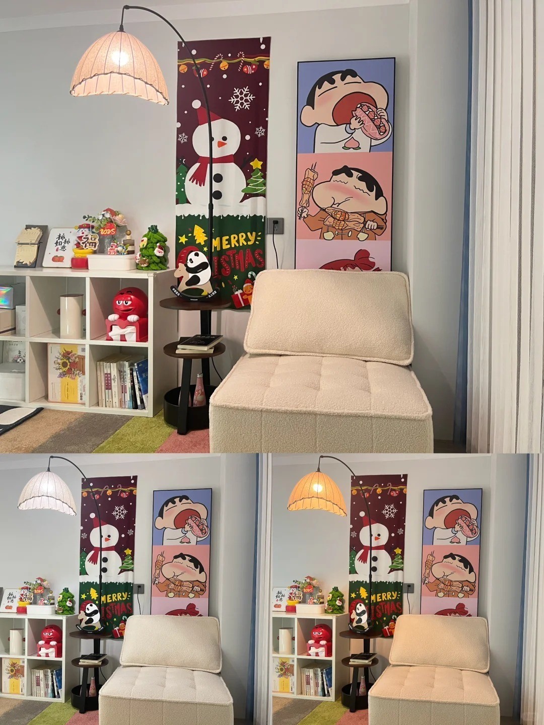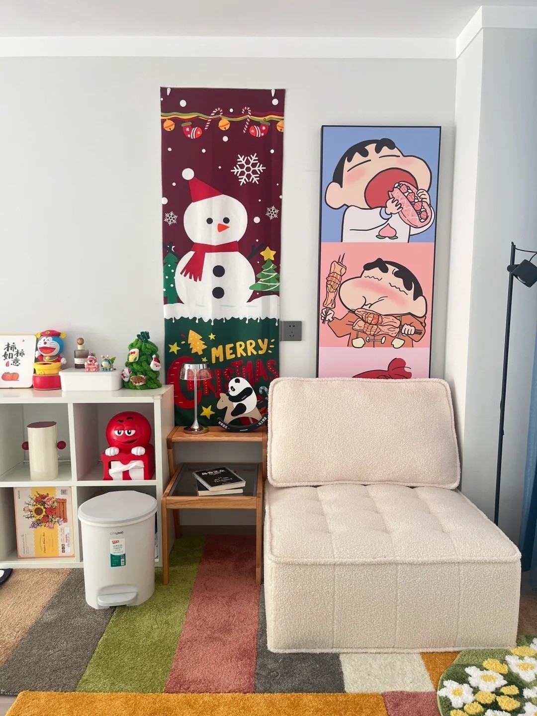 墙壁上挂了两幅卡通海报,一幅是雪人,另一幅是蜡笔小新,充满了童趣。地下放置着一张折叠沙发,向内推就是方形小沙发,往外拉则变成了一张小床,设计非常巧妙。