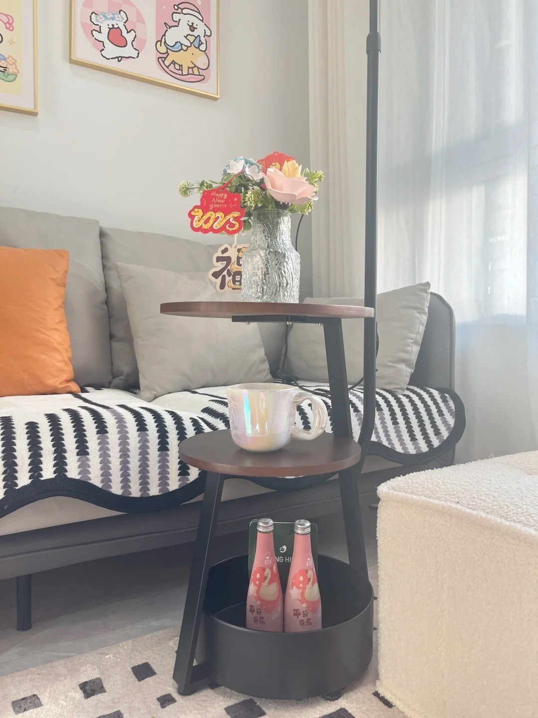 同时,为了方便放置物品,在靠近沙发的位置还配置了一台带置物架的落地灯,平时用来放置杯子、书籍等都非常方便。