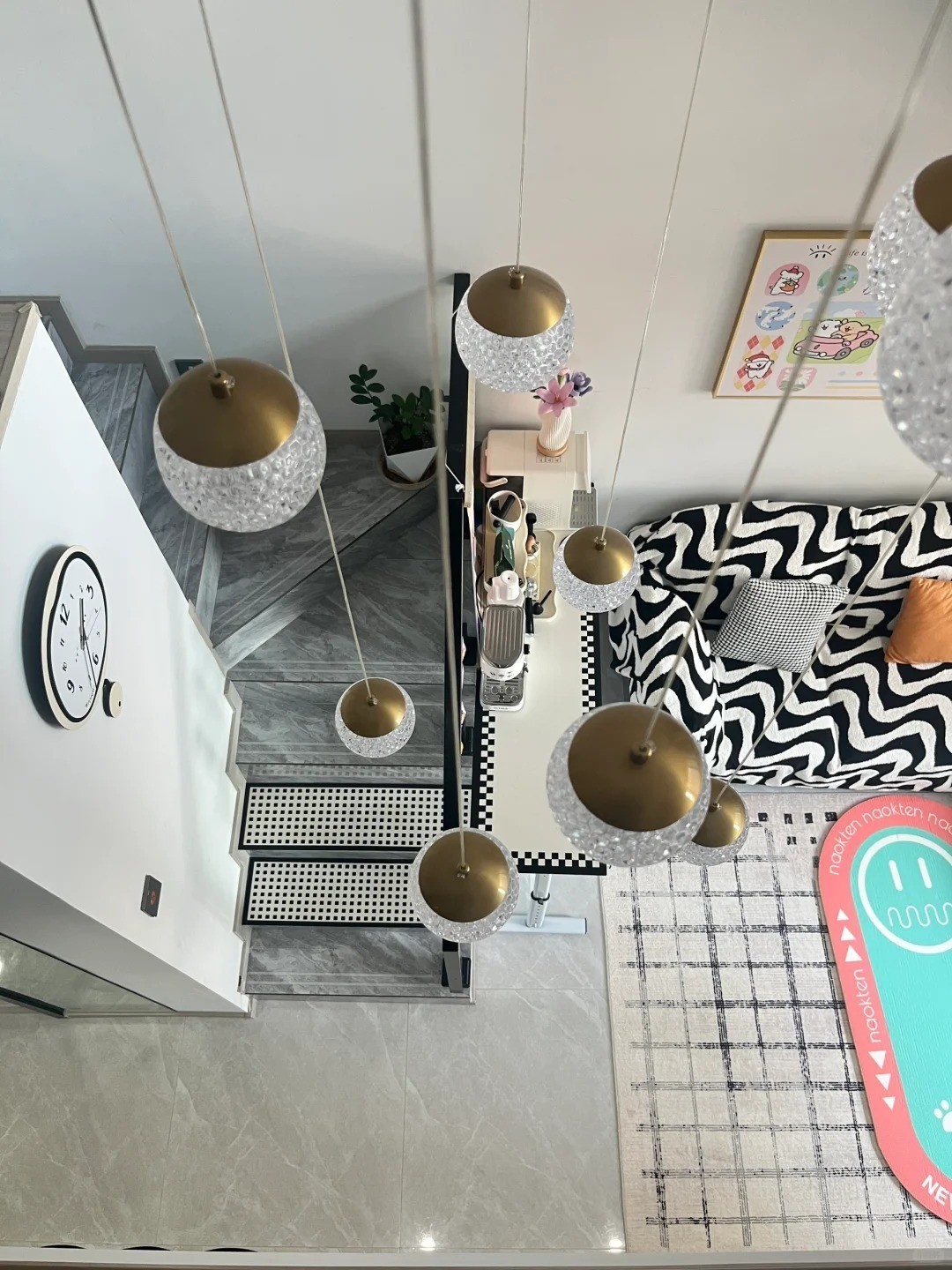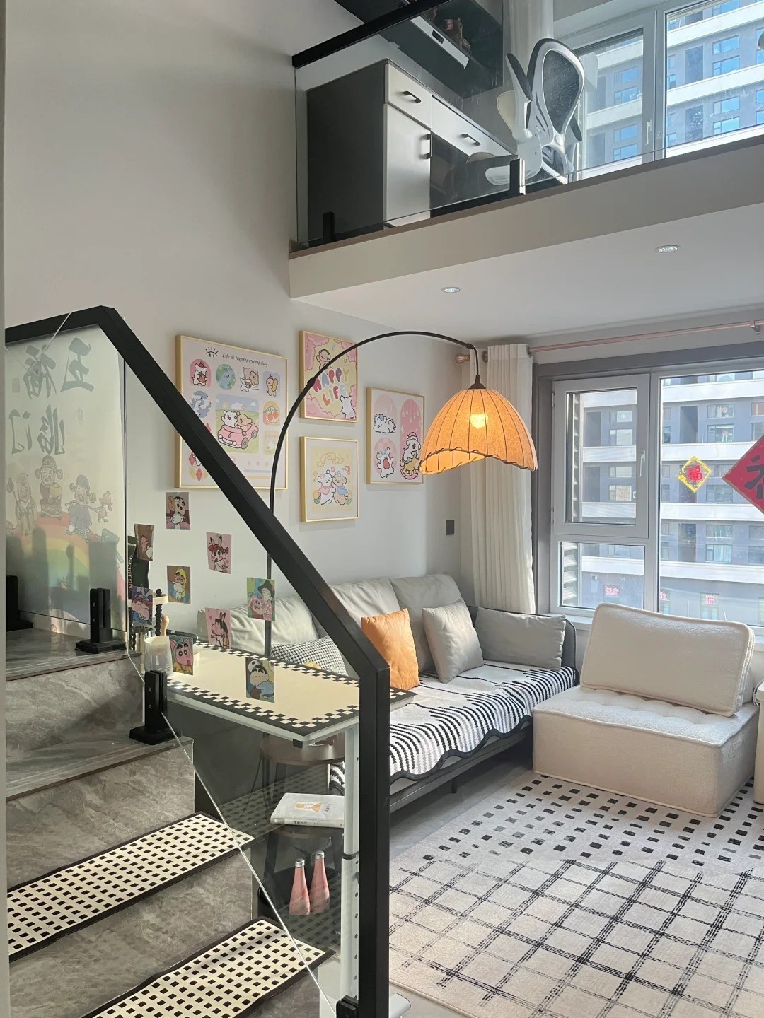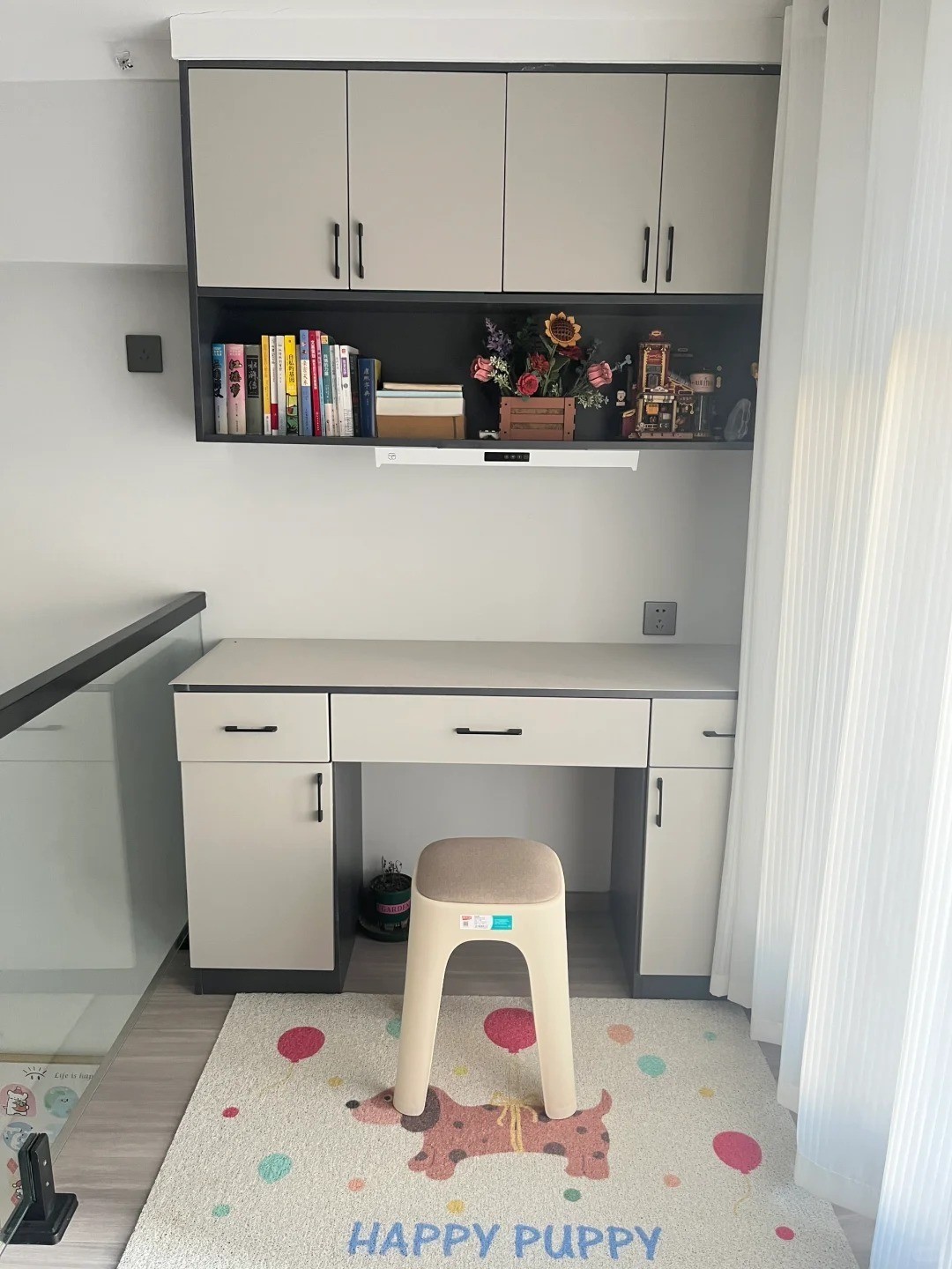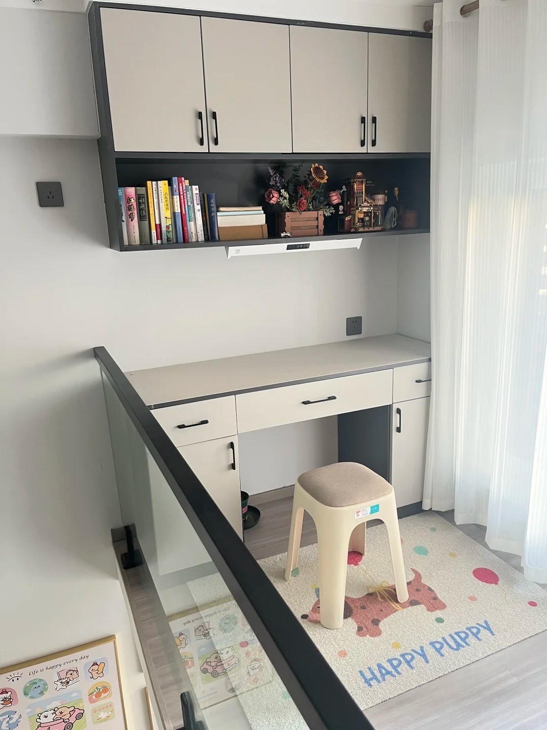 右侧则是二楼的主卧。相较于其他功能区,这个空间显得格外温馨。地面铺设了一张拼色毛绒地毯,走道靠窗位置摆放了一组开放格置物架,上面还装饰了一些可爱的摆件,给人一种温馨舒适的感觉。