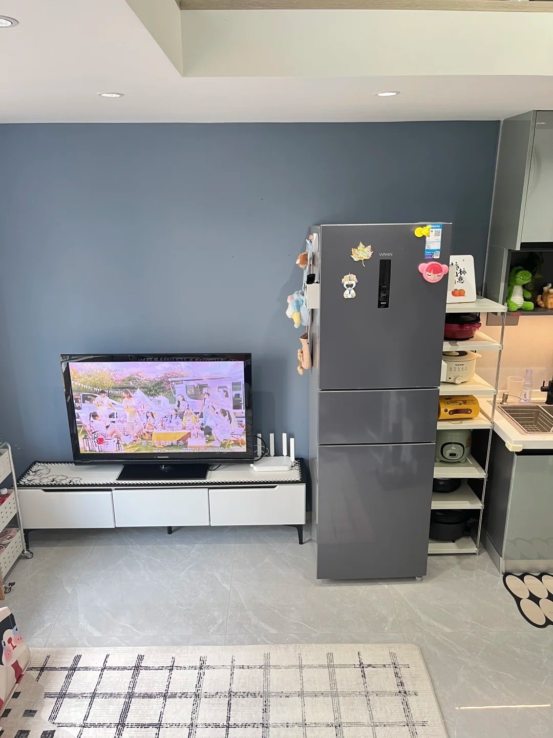 ③冰箱位于橱柜旁边,恰好镶嵌在内墙之中,处于厨房与客厅之间,既方便取用食材,又能起到隔断的作用,可谓一举两得。